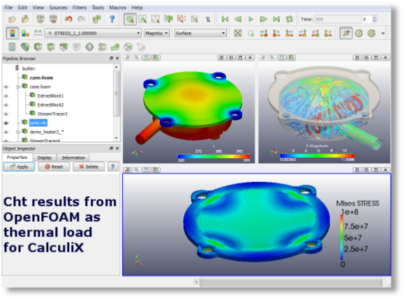 Für CalculiX bietet DHCAE Tools einen exzellenten Datenkonvertierer in VTK an: Nach der Konvertierung von CalculiX-Ergebnissen in das VTK-Format können Sie Ihre Ergebnisse in ParaView direkt neben Ihre OpenFOAM®-Ergebnisse importieren und nachbearbeiten.